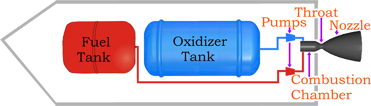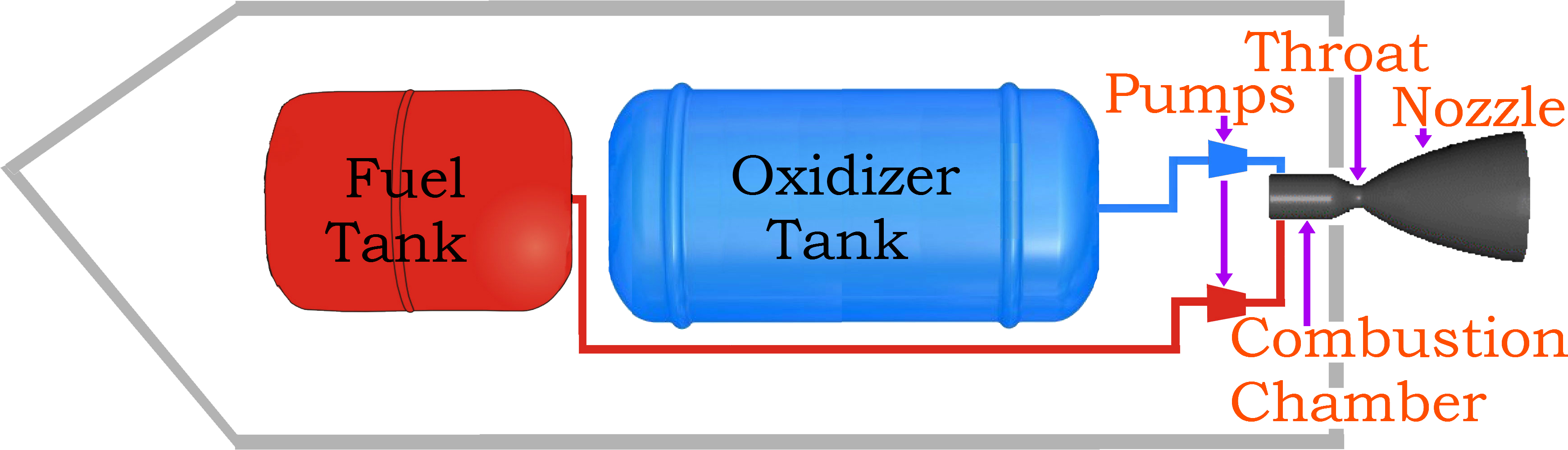 In liquid-propellant engines, the fuel and the oxidizer are stored in separate tanks and pumped into a combustion chamber, where they mix and ignite. This design provides much greater control, allowing thrust to be adjusted during flight, engines to be shut down and restarted, and precise orbital maneuvers to be carried out long after launch.